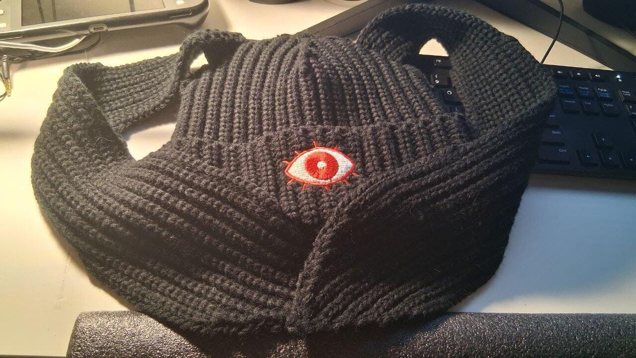 Behold! The Banny Beanie! This cute black knit beanie features two long rabbit ears and a large red eye embroidered on the brim. Made of acrylic yarn.
