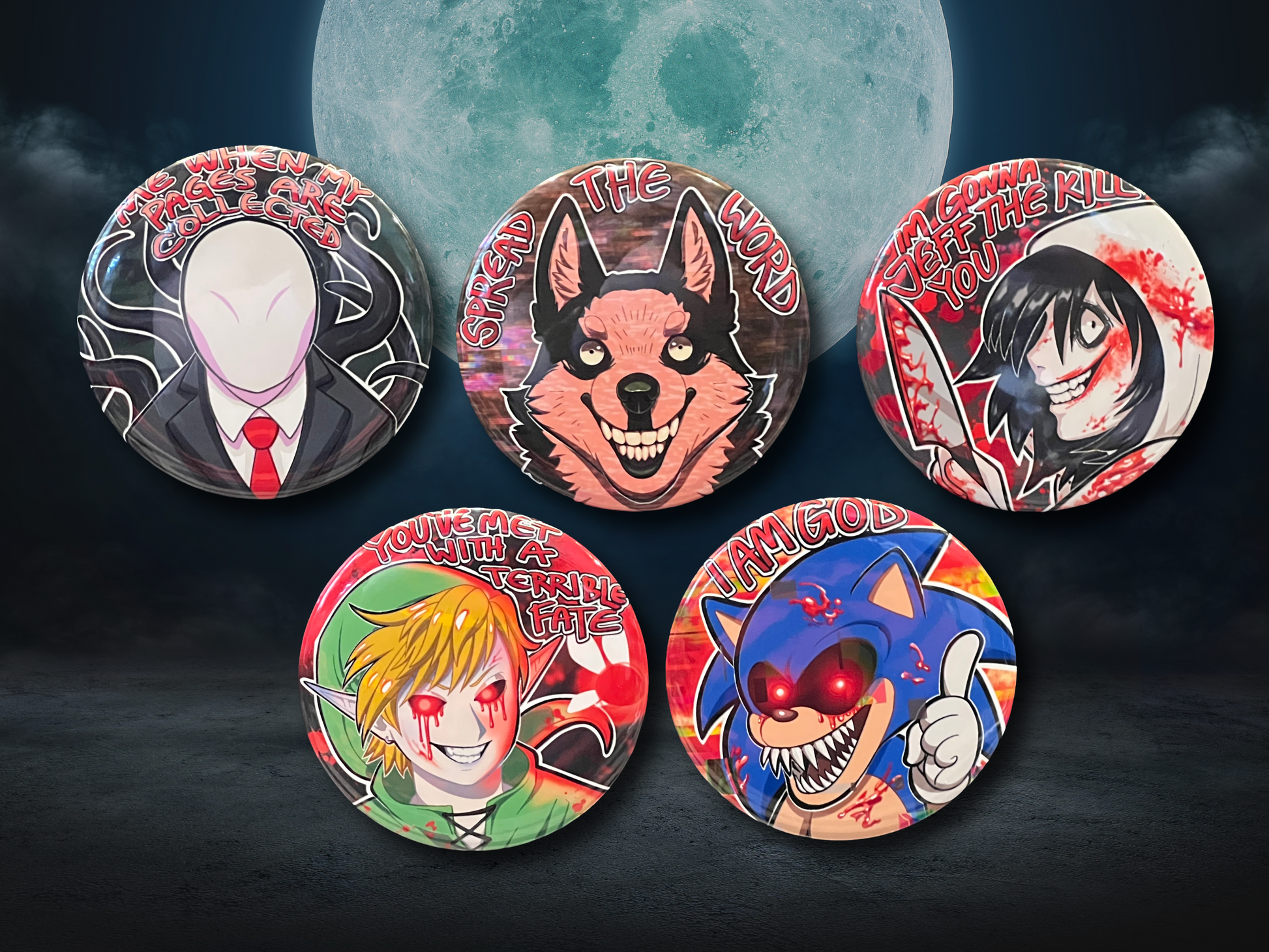 3 inch (75mm) sized buttons of some classic creepy-scary characters. Classic button pin back.