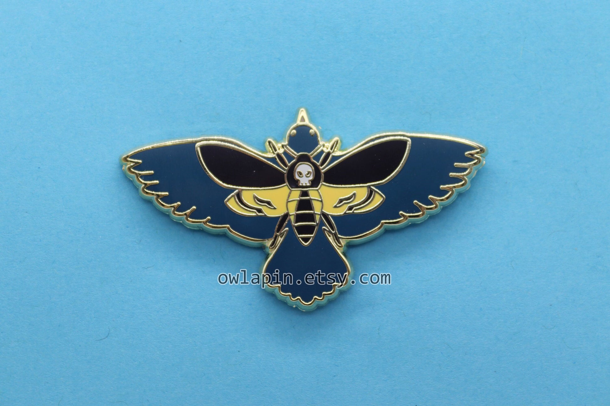 Hard enamel enamel pin of a death's head hawkmoth over a starling bird, inspired by the Hannibal Lecter movie SIlence of the Lambs. Pin is about 2" long, with two posts and black rubber stoppers.