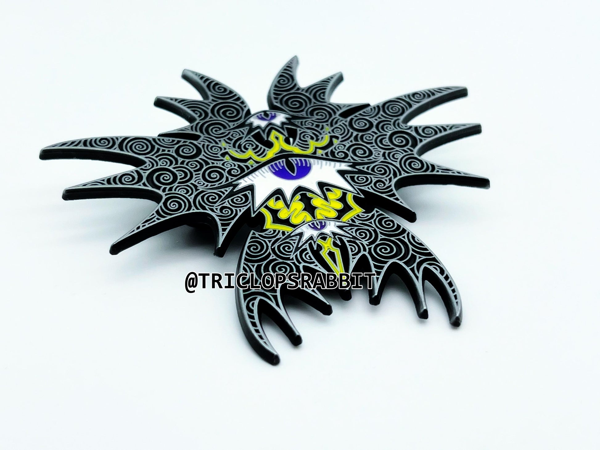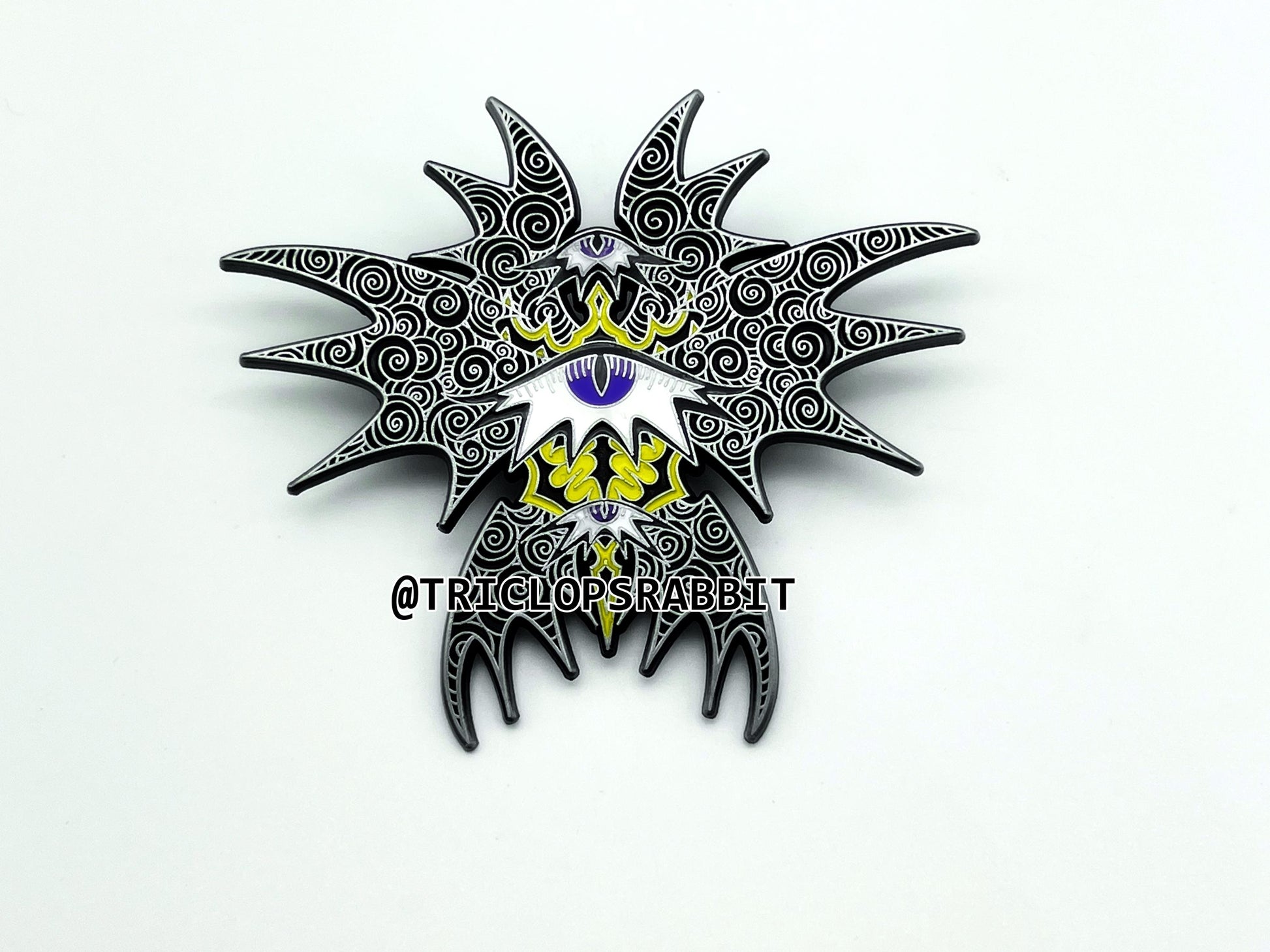 Large demonic enamel pin! Recessed silver metal makes up the swirl patterns in the wings, the color is epoxy-coated enamel!