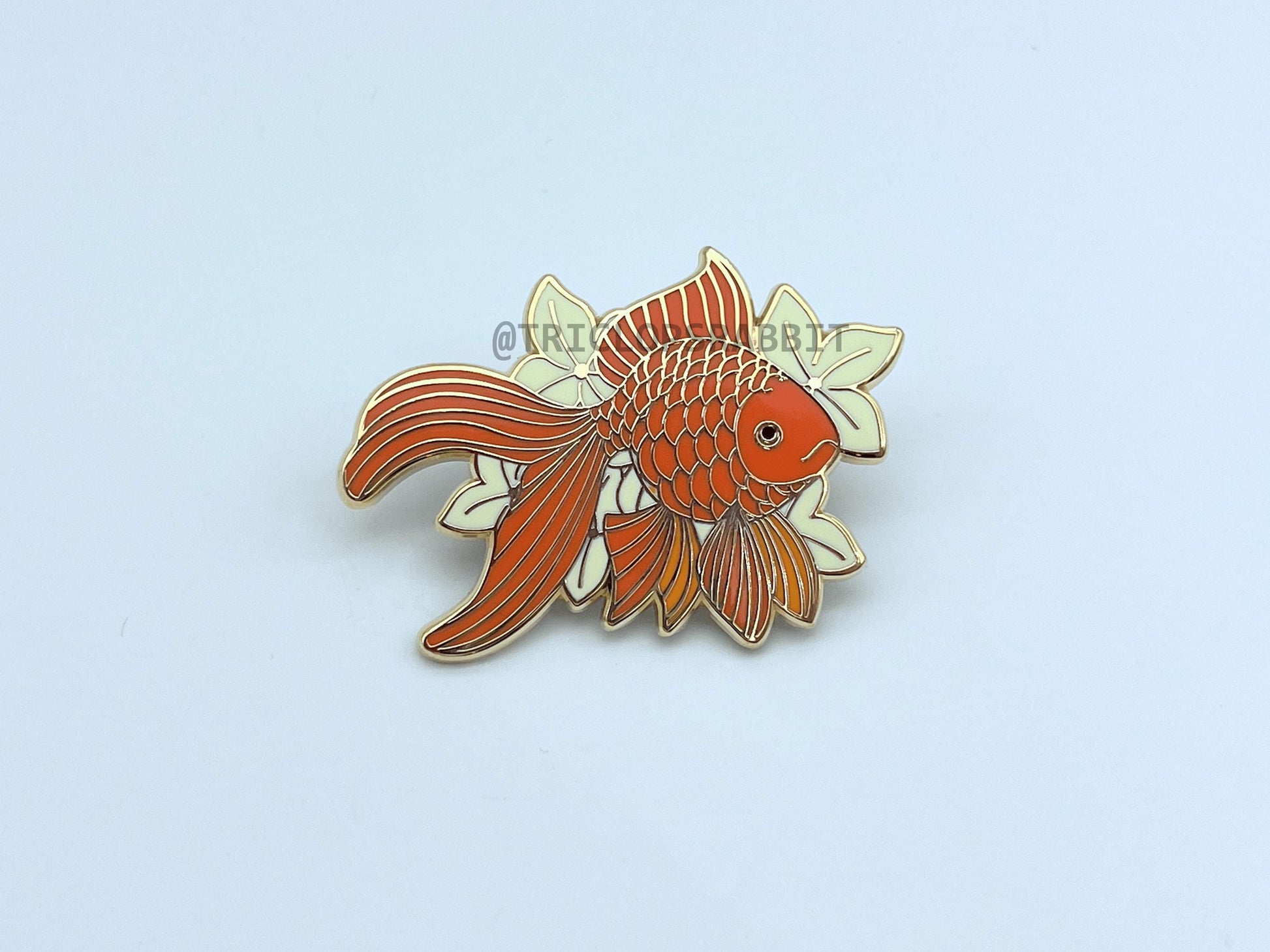 Hard enamel lapel pin of a goldfish against flower petals. Pin is about 2" at the widest point, with two posts and black rubber stoppers.