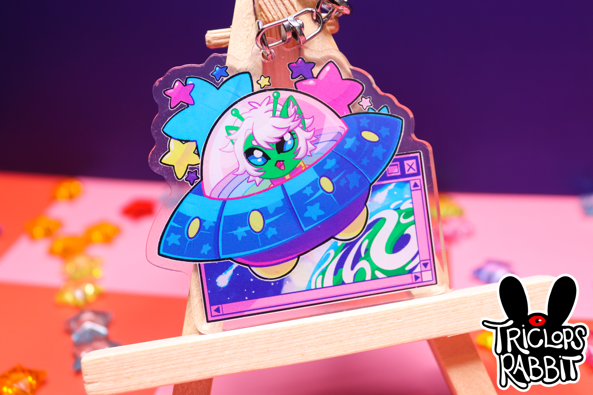 Keychain is acrylic with a clasp keychain attachment. It's about a 2.5 inch / 6cm square.