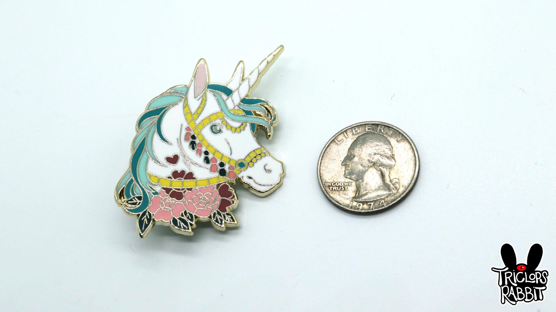 Hard enamel pin of a lovely unicorn wearing a bridle.